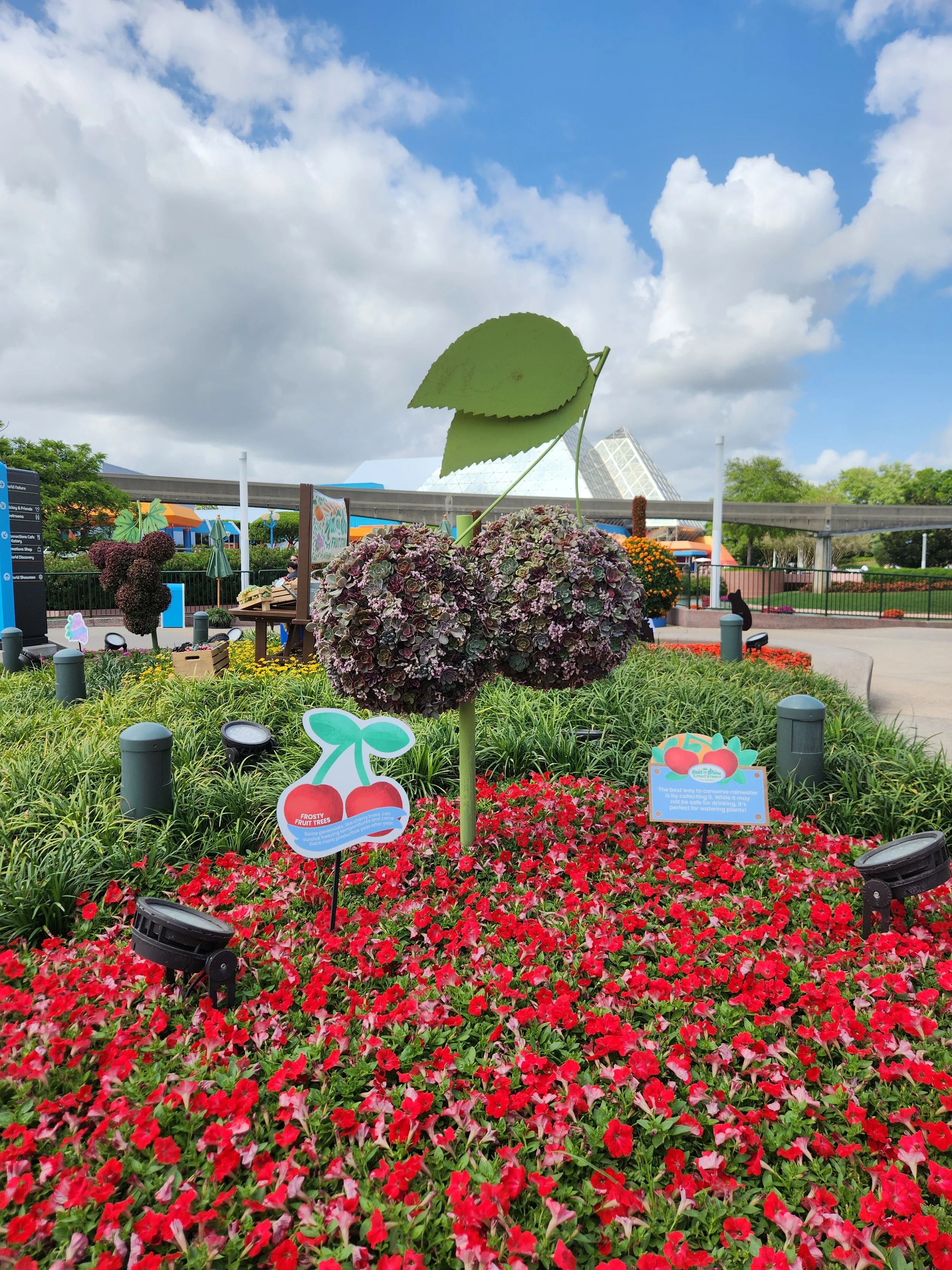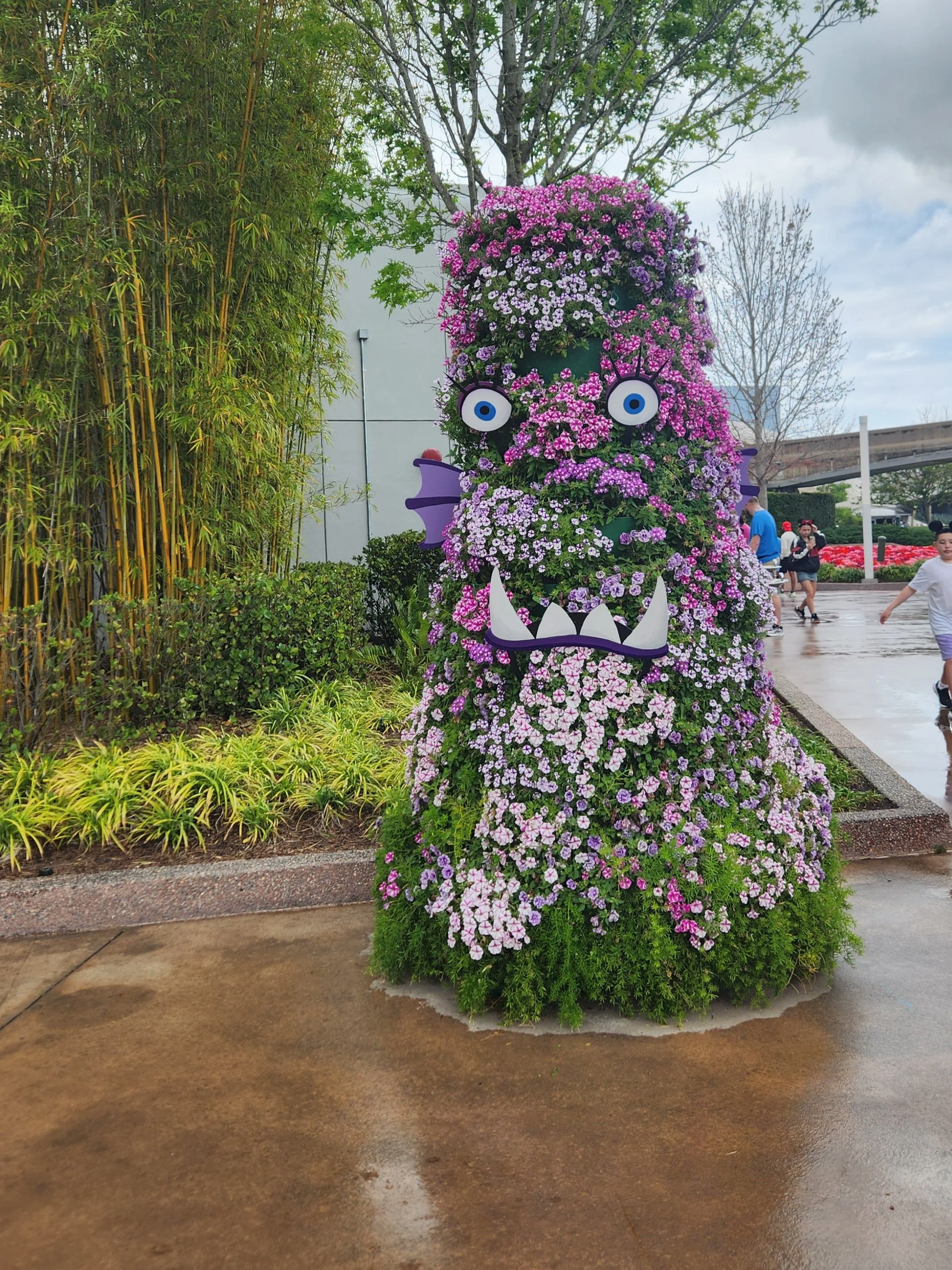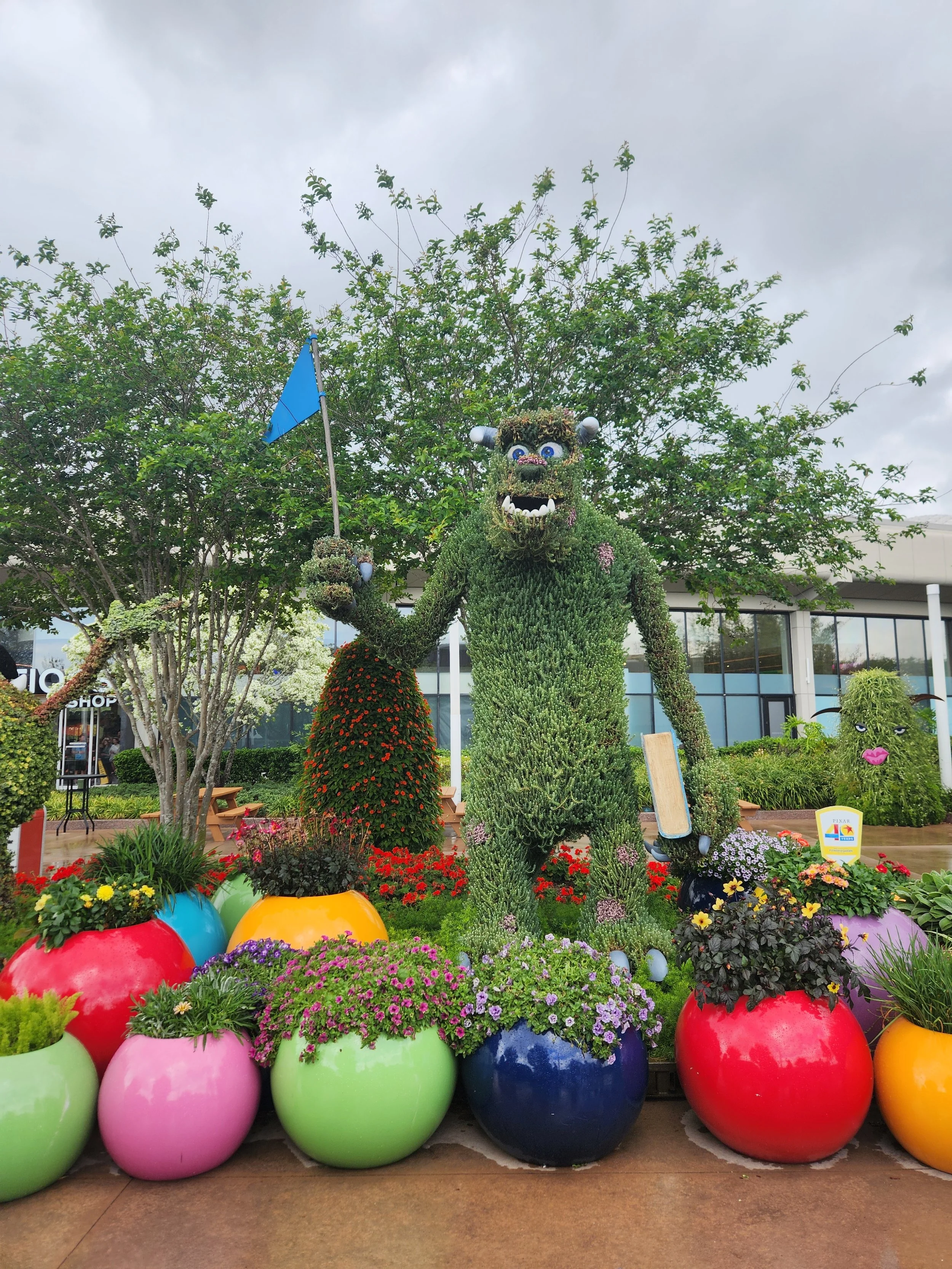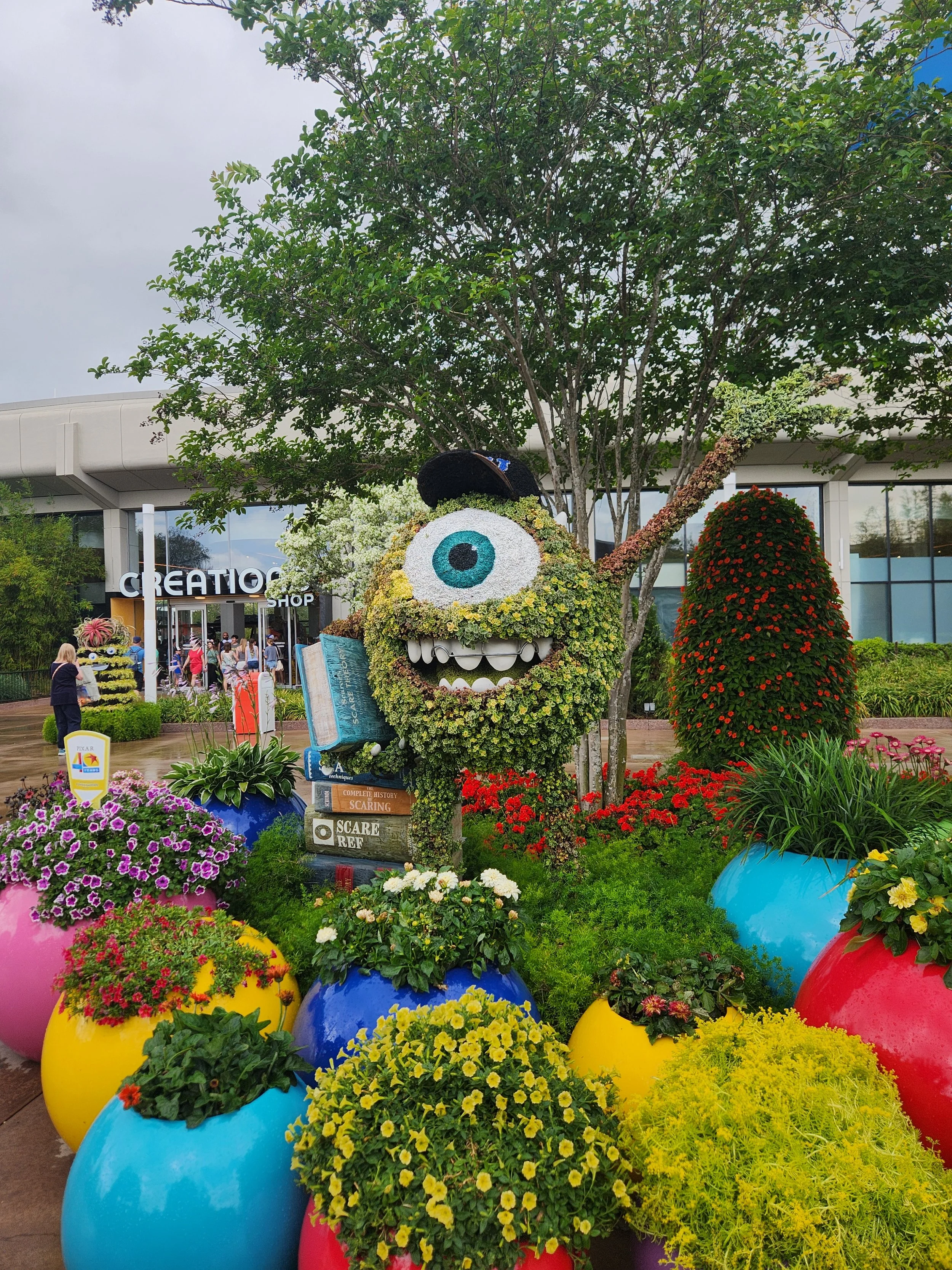 My favorite was the area themed to Monsters University near Creations Shop. They had Mike and Sully surrounded by brightly colored planter pots filled with flowers. I loved all the little details–they even included a stack of Mike’s books and his Monsters University hat. The surrounding bushes were designed with eyes and mouths to look like monsters, and it was such a simple idea that completely transformed the space.